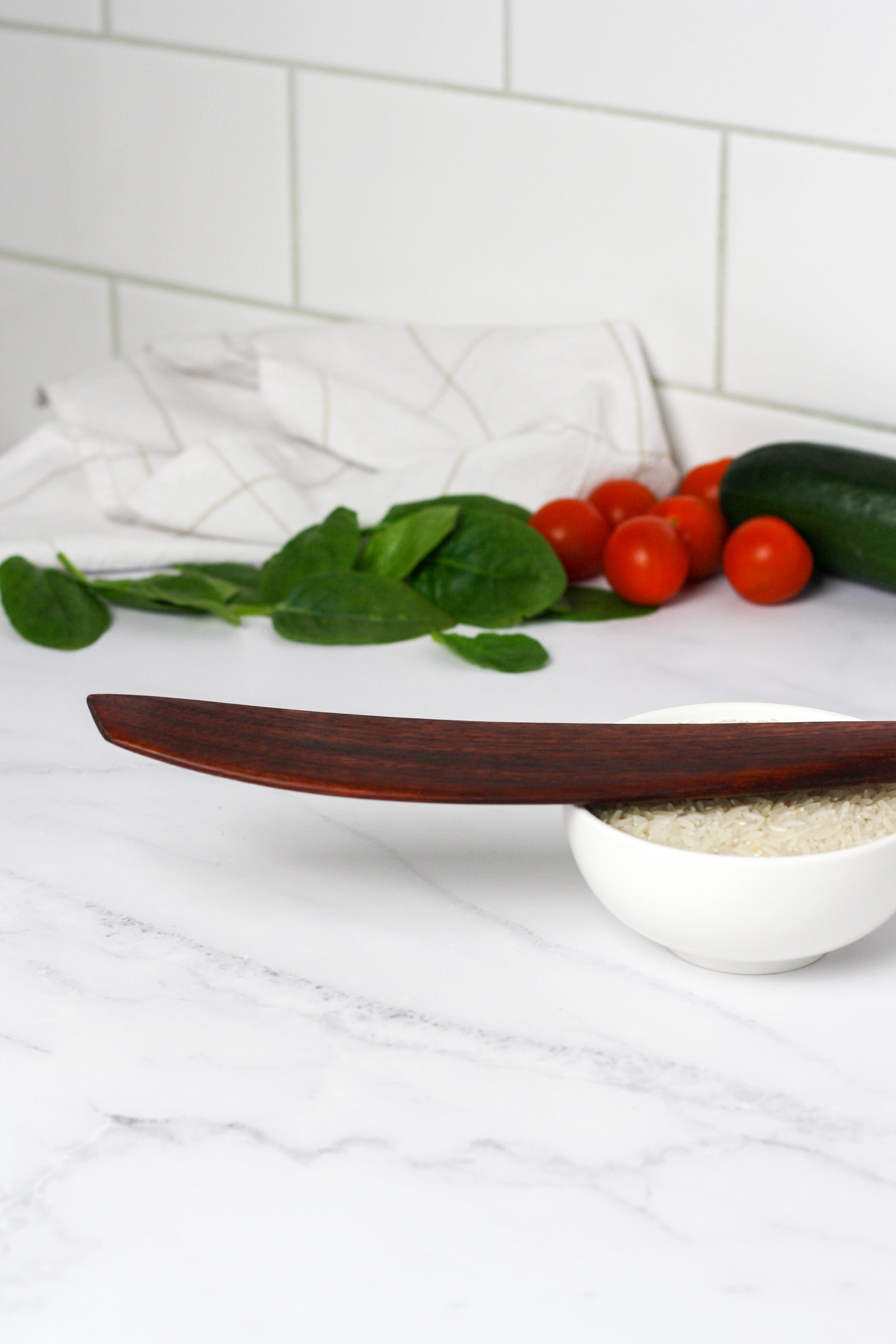 This Jarrah timber stirring rod is a versatile kitchen tool designed for multiple tasks. Its sturdy construction makes it ideal for mixing ingredients directly in your pot, while the specially crafted flat edge efficiently scrapes food from the bottom of pots and frying pans without causing any scratches. Crafted to combine durability with gentle care, it ensures thorough stirring and cleaning without damaging your cookware.